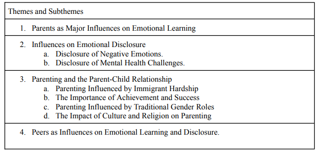 As demonstrated above, research on the relationship between parenting styles and emotional expression and regulation has mostly focused on samples drawn from Western cultures, specifically Europe and the United States of America. McCord & Raval state that current research “provides an inadequate account of parental emotional socialization…among ethnic minority groups in the United States” (2016, p. 466). Even less research has considered how and whether parenting styles, acculturation, and social factors contribute to one’s emotional expression during adulthood.