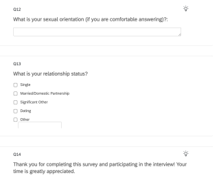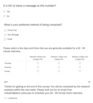Many of the questions I will be asking you will ask you to share personal experiences around important relationships in your life such as your parents and your peers. As these questions are personal, they may cause some emotional discomfort. If you are experiencing any distress you can ask the researcher to stop the interview or choose not to answer any questions at any time during the interview. In the case that you choose to end the interview, you will not be penalized for that decision. Do you have any questions around the information I just shared with you?