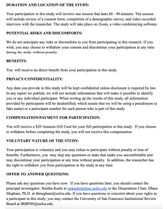 Hello! Thanks for joining today. I know you have received communication from me before but just to remind you, my name is Smitha Kashi and I am a doctoral student at the University of San Francisco. I am trying to learn more about what contributes to emotional expression when individuals are young adults (18 – 24 years old). I’m also really interested in learning about this process within our South Asian community. I myself identify as South Asian and I am curious about how this developmental period has been for other South Asian folks. Today we are going to talk for about 60 – 90 minutes and I’ll have some questions to help us with this conversation. Before we proceed, do you have any questions?